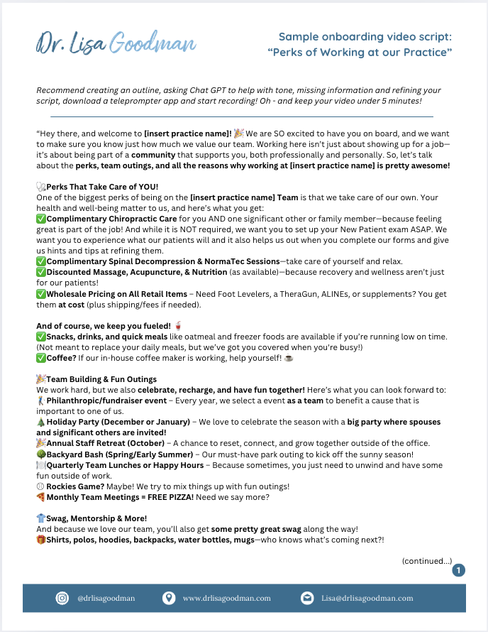 I recommend 10-20 videos as part of your practice’s onboarding course. This script is one of my favorites as it helps your new hire see the value and perks that you provide for them! “Perks of Working at our Practice”